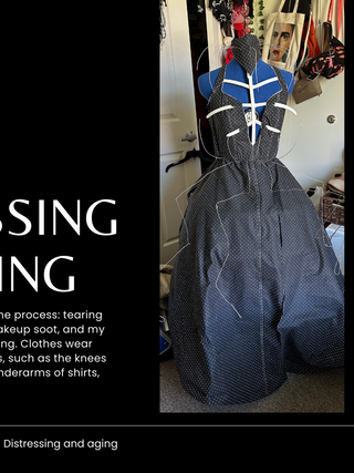 I wanted to create something that rejected everything you would want in a mother. Sharp aspects, withered, scary, and untouchable. To emphasize Other Mother's disgusting undertones, I draped fake spiderwebs across the dress. Ripping the skirt and adding fake soot, the dress was properly aged.